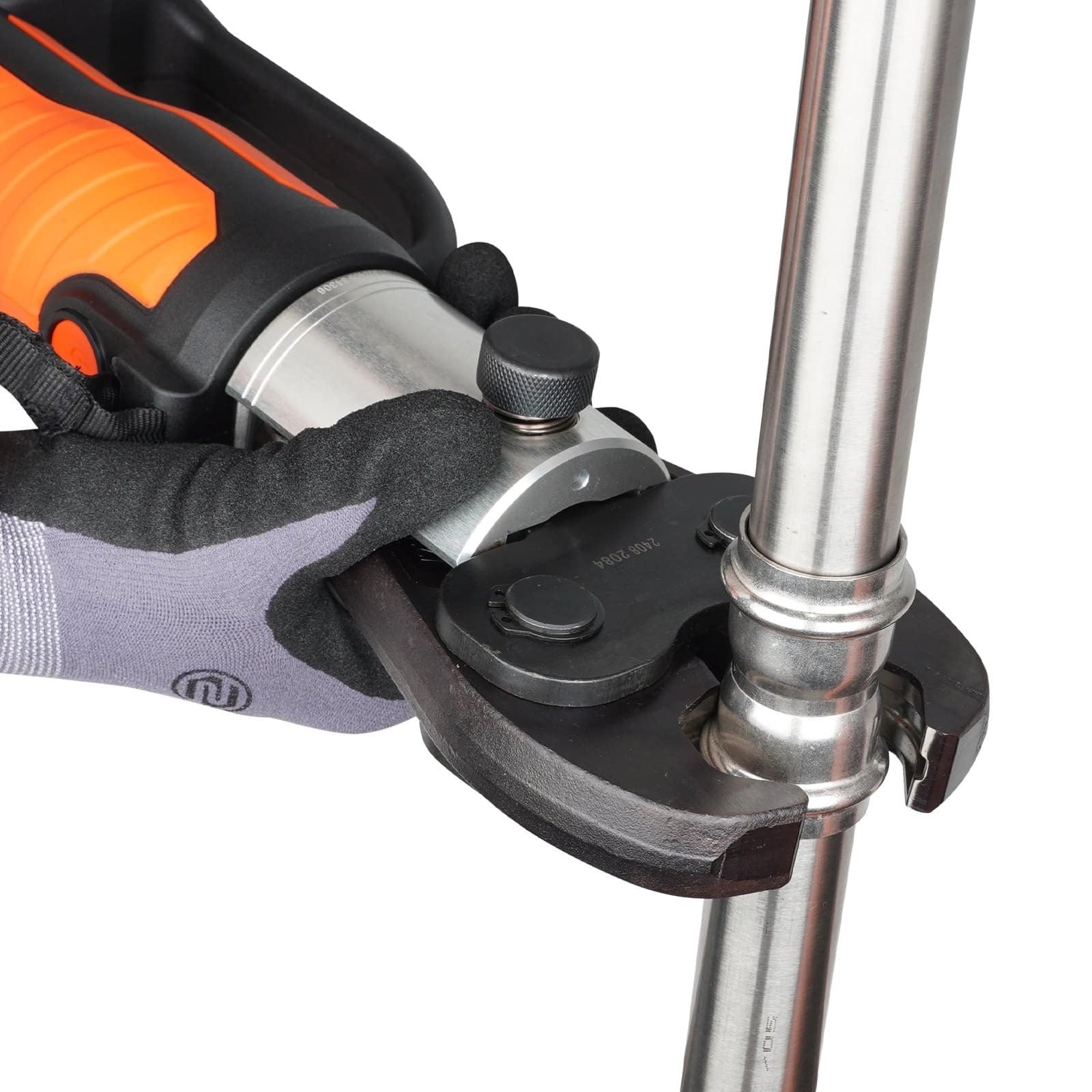 Patogus naudojimas: Šis elektrinis vamzdžių spaudimo įrankis yra kompaktiškas ir puikiai tinka darbui ankštose erdvėse ar virš galvos. Ergonomiškos formos rankena suteikia didesnį komfortą; saugos kaištis fiksuoja antgalius vietoje, kad būtų išvengta nesaugių situacijų, ir suteikia vartotojui daugiau lankstumo bei patogumo.