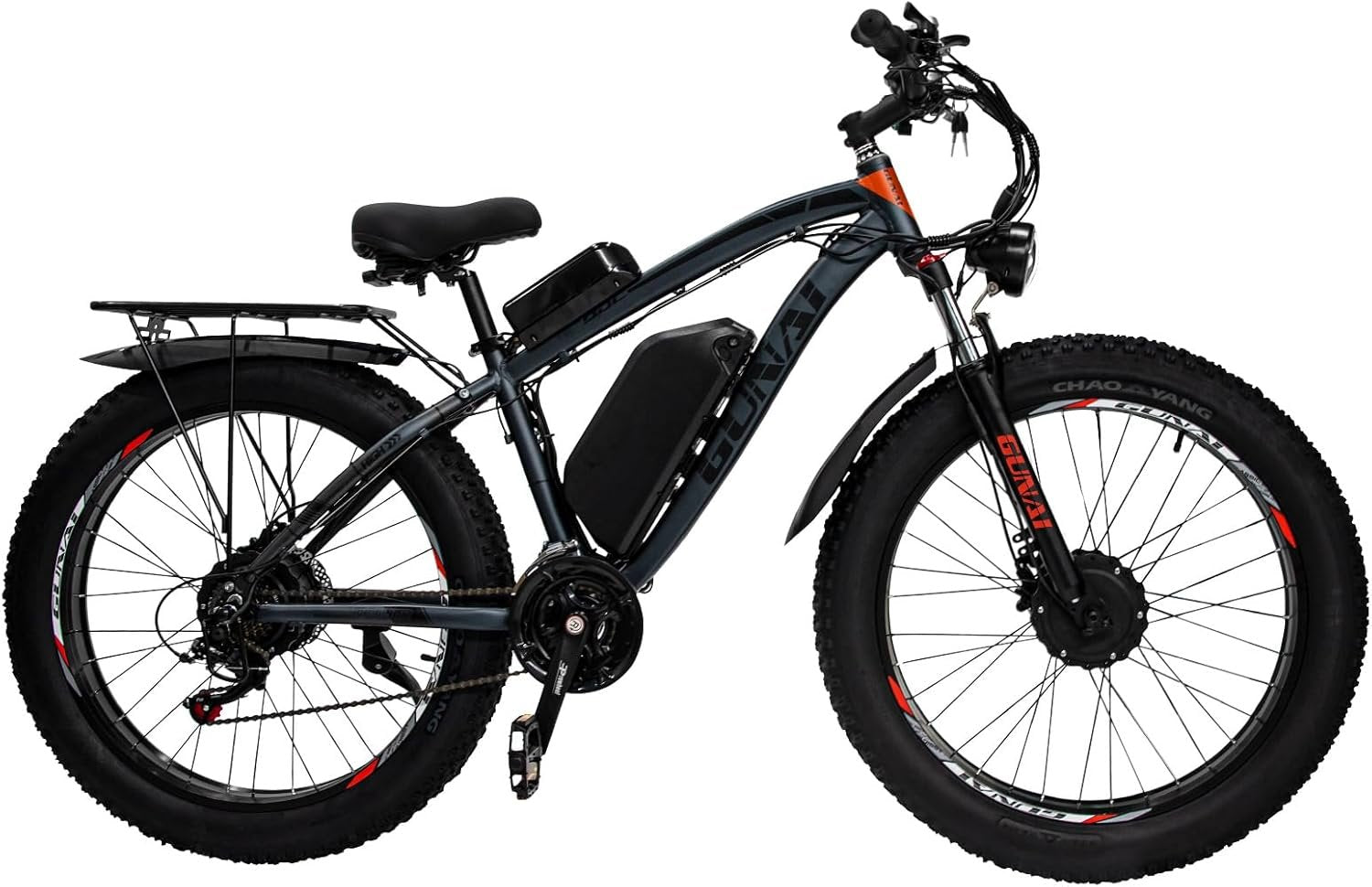 21 pavaros Shimano sistema suteikia galimybę tiksliai pritaikyti važiavimo režimą pagal dangą ar asmeninius poreikius. Tai leidžia lengvai važiuoti tiek lygiais keliais, tiek kalnuotais maršrutais. 26 x 4.0 colių padangos užtikrina puikų sukibimą net ir sudėtingose sąlygose – smėlyje, purve, sniege ar žvyre.