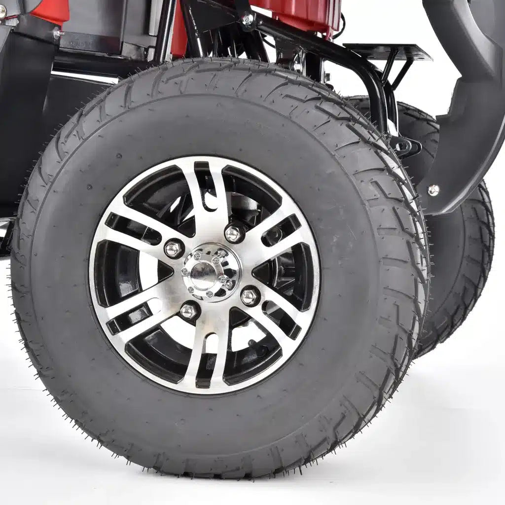 • Dideli ratai su kokybiškomis bekelės padangomis, montuotomis ant aliuminio ratlankių