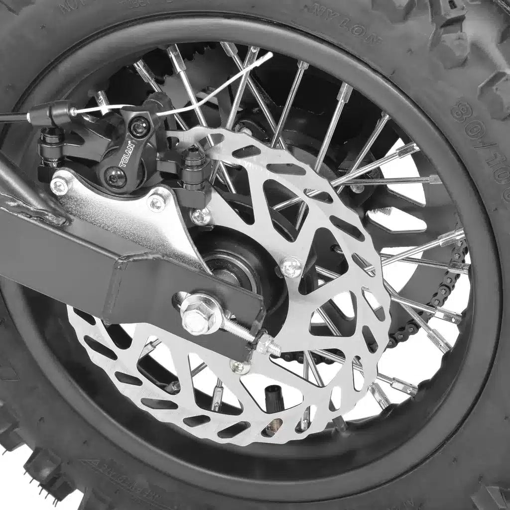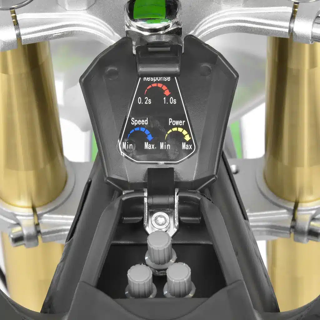 Motociklas sveria 45 kg, todėl yra stabilus ir patikimas važiuojant didesniu greičiu. Įrengti 10/12 colių ratai užtikrina gerą sukibimą su danga, o galimybė reguliuoti maksimalų greitį leidžia pritaikyti važiavimo savybes pagal naudotojo patirtį ar saugumo poreikius.
