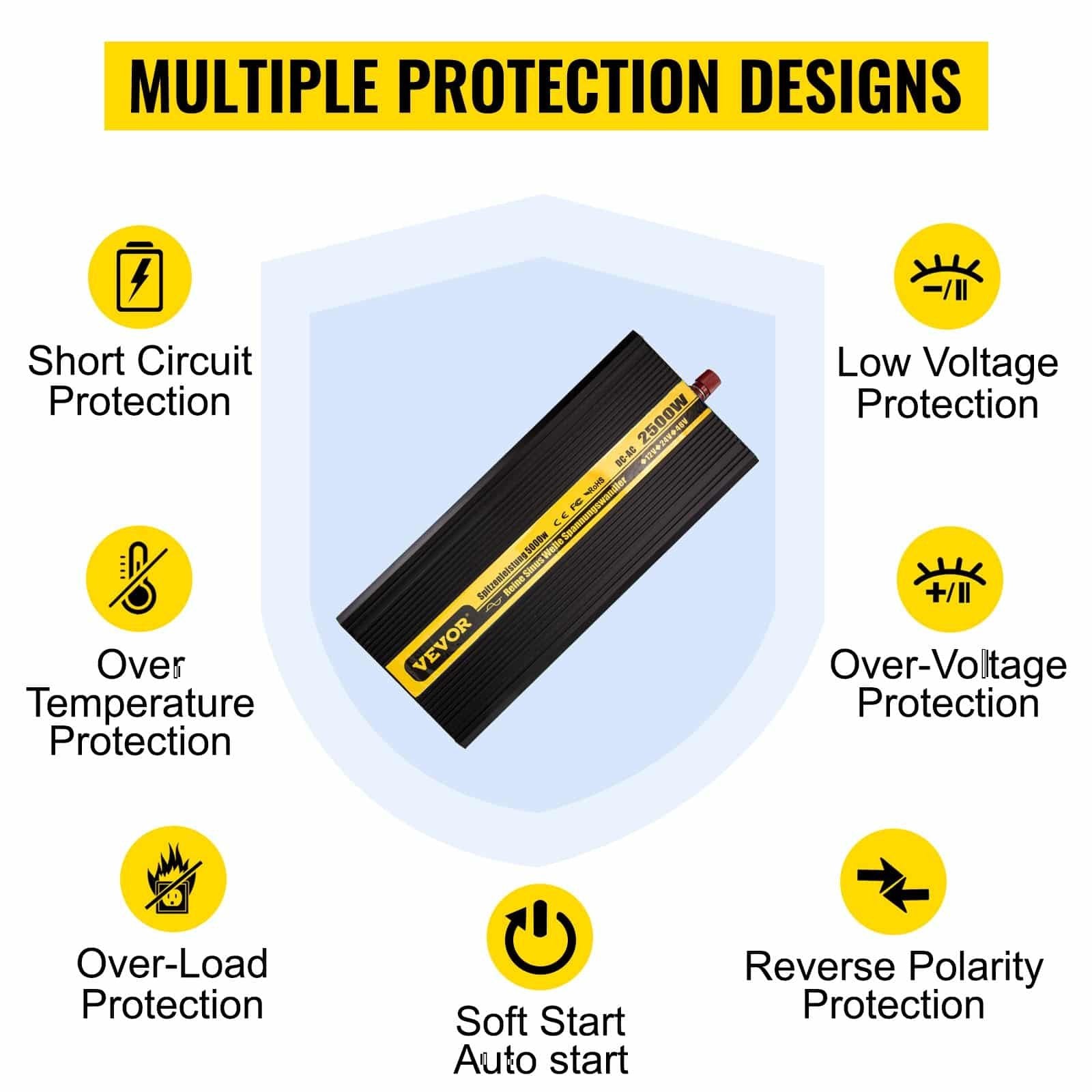 Patikima apsauga: Yra šešios pagrindinės keitiklio apsaugos priemonės: apsauga nuo trumpojo jungimo, apsauga nuo per didelės temperatūros, apsauga nuo perkrovos, apsauga nuo įtampos, apsauga nuo viršįtampių ir atvirkštinio poliškumo.