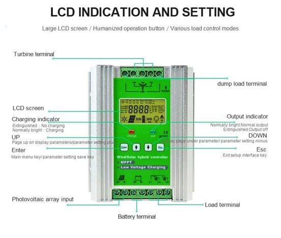 Šis vėjo ir saulės hibridinis įkrovimo valdiklis – tai išmanus sprendimas tiems, kurie nori efektyviai panaudoti atsinaujinančią energiją iš AC/DC vėjo generatorių arba saulės modulių. Įrenginys palaiko vieningą arba atskirą saulės ir vėjo įėjimą, automatiškai atpažįsta 12 V arba 24 V sistemą ir užtikrina optimalų įkrovimą naudojant MPPT (Maximum Power Point Tracking) technologiją.