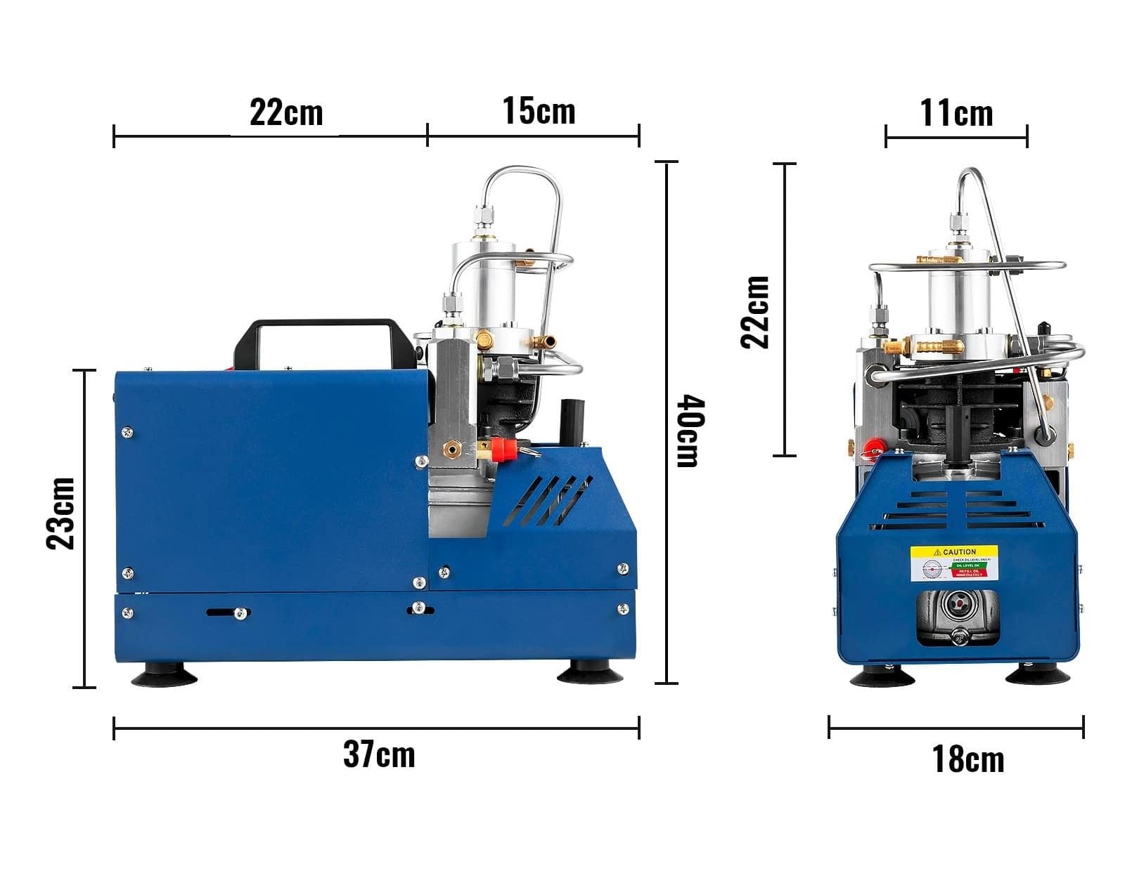 Našumas: Šis aukšto slėgio PCP kompresorius turi galingą 1800W varinį variklį. Maksimalus darbinis slėgis yra 300 BAR / 4500 PSI / 30 MPA, pripūtimo greitis yra 2800 RPM, o srautas yra 50 l/min. Įrenginys automatiškai pats sustos, kai pasieks jūsų iš anksto nustatytą slėgį.