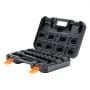Patogus laikymas ir lengvas transportavimas: rinkinys pateikiamas vidutinio dydžio metaliniame įrankių lagamine, kuris leidžia patogiai transportuoti įrankius. Lagaminas užtikrina tvarkingą įrankių laikymą ir padeda išvengti jų išsibarstymo ar praradimo.