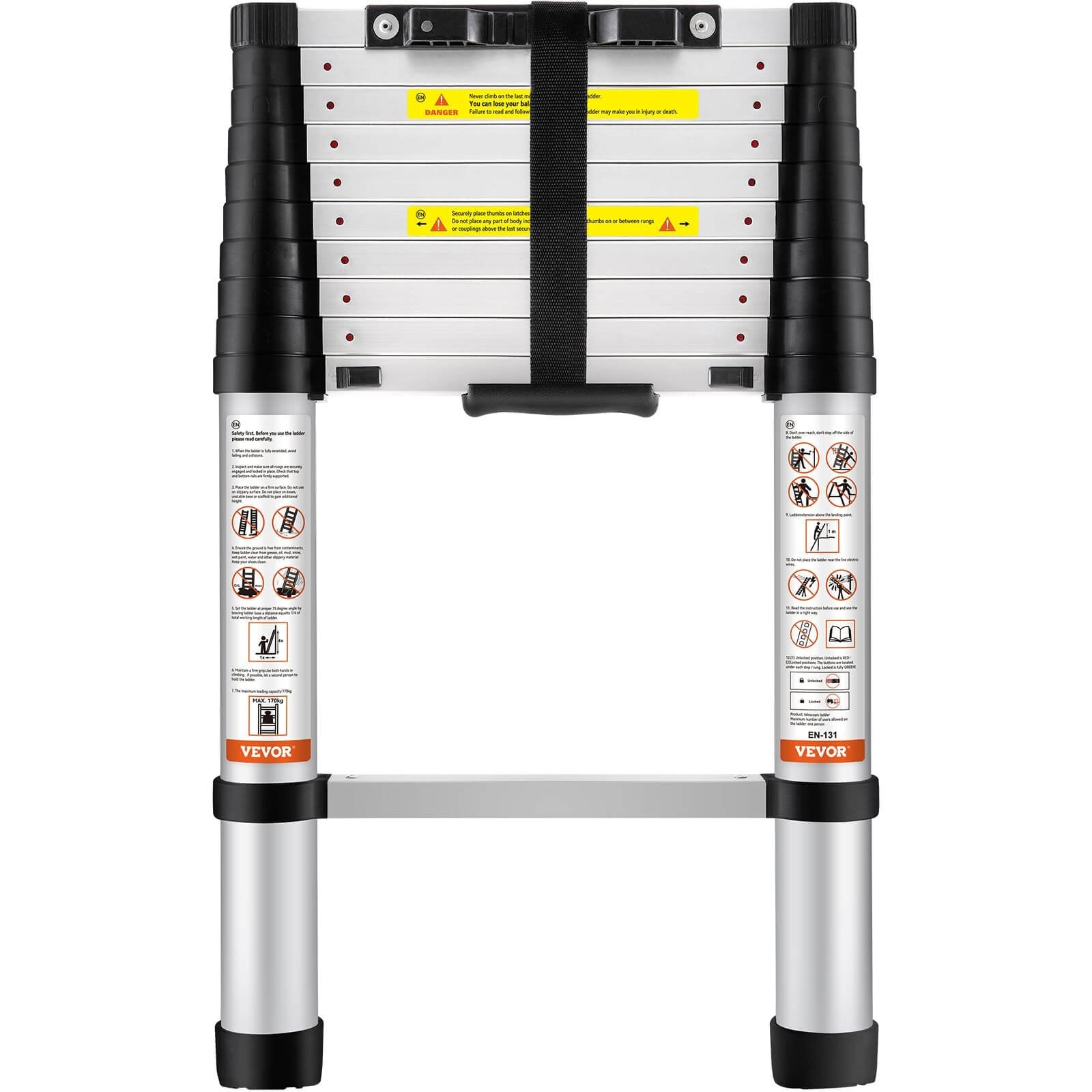 VEVOR teleskopinės kopėčios pagamintos iš aviacijos klasės aliuminio lydinio, kurio maksimalus apkrovos talpumas siekia 375 lbs (170 kg). Plastikiniai jungiamieji komponentai sustiprinti nailono plastiku, todėl jie yra labai tvirti ir neskyla, nepalikdami plastiko žymių. Be to, kopėčios atitinka ANSI ir N131 standartų reikalavimus, užtikrinant ilgą tarnavimo laiką. Pasiruoškite pasiekti naujas aukštumas!